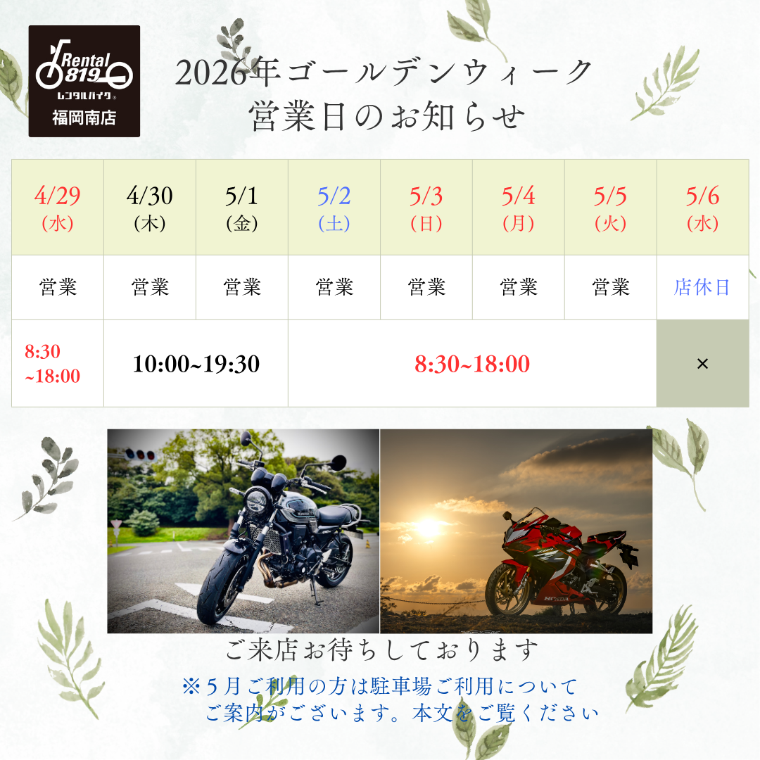 レンタル819福岡南店よりゴールデンウィーク期間中の営業日時と駐車場のご案内です。